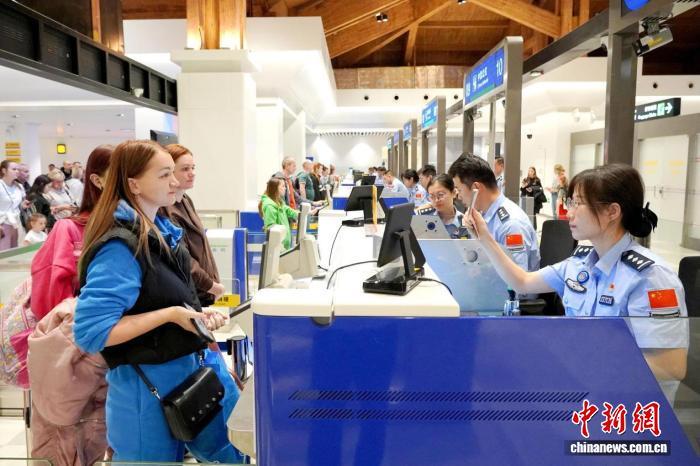 2026年1月1日凌晨,从俄罗斯符拉迪沃斯托克起飞的SU856航班,机上载有155名乘客,安全降落在三亚凤凰国际机场。图为游客正在办理出入境手续。王成龙供图